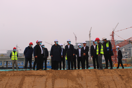 王亮一行首先来到生态水系西区工程体育公园施工现场,认真听取现场负责人工程建设情况汇报,详细了解建材中心、地下车库和环道的主体结构、防水层铺设施工进展,重点询问体育馆钢结构施工进度和下步计划,现场检查安全环保及疫情防控措施落实情况。