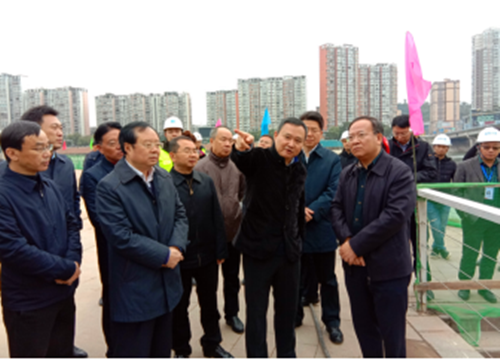 在由我公司实施的简阳市河东污水处理厂及配套管网项目绛溪河、沱江河截污干管施工现场(人民公园外鱼嘴处),罗开敏副书记向杨洪波副省长一行汇报了简阳市近年来对绛溪河、沱江河流域水环境治理方面所取得工作成效及下步规划布局,并重点汇报了简阳市河东污水处理厂及配套管网项目之老城区雨污分流改造工程及绛溪河、沱江河截污干管工程建设意义及推进情况。
